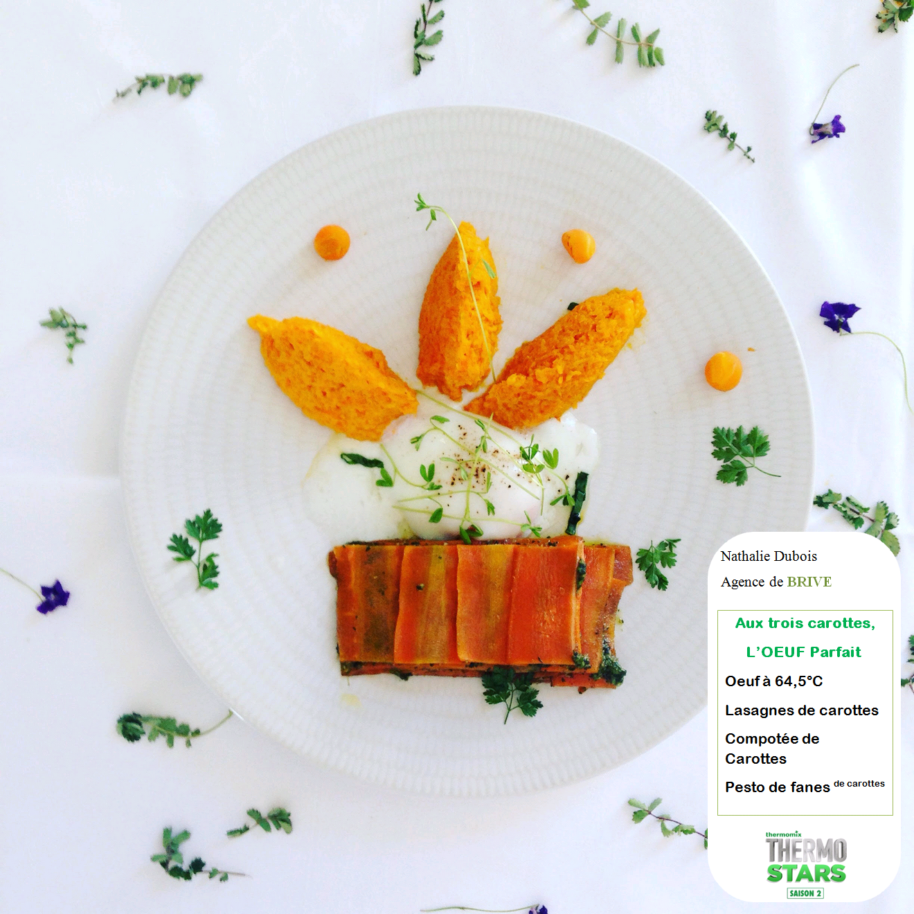 Super belle assiette , on a vraiment envi de gouter bravo Nathalie tu es une super star,thermo star, mega star Allez allez allez pour "AUX TROIS CAROTTES OEUF PARFAIT" toute l'equipe est avec toi BRAVO