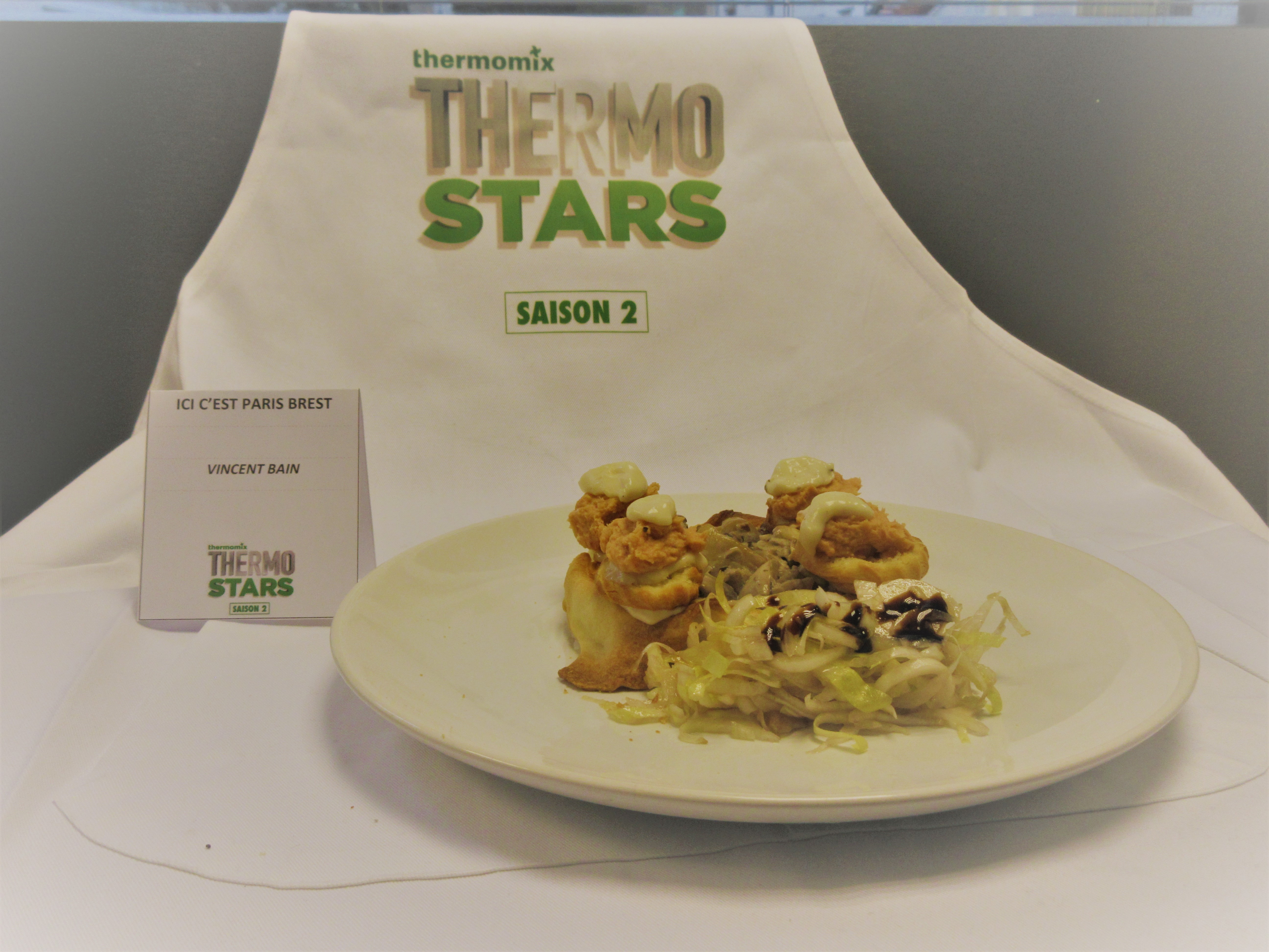 déposer dans chaque choux et sur le cercle de pate à choux, aux quatre coins un trait de béchamel